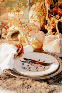 When it comes to hosting Thanksgiving dinner, the opportunity for amping up a holiday tablescape is all but expected. Why not take a chance and bring together a dining experience short of a lavish stage production? All you need are three distinct attributes: art, whimsy and drama. For the artistic element, handpainted plating and custom table linens can provide intrigue and style. For a touch of whimsy, bring the table outdoors and fill the surrounding area with festive iconography of the season. In this case, it’s pumpkins, gourds and hay bales. Lastly, nothing says drama like a towering sculpture of eye-catching florals set center stage. With these simple but effective elements, your party guests will be talking about this holiday tablescape well into the new year.
