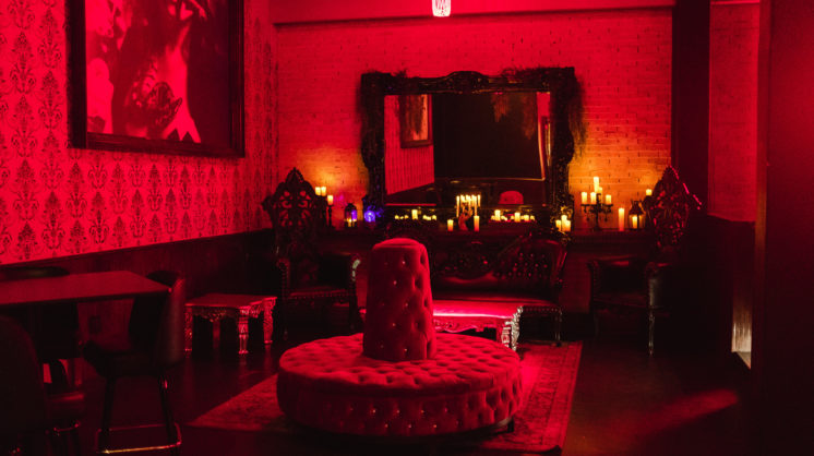 VooDoo Niteclub cultivates classic Gothic Victorian New Orleans design with French antique upholstery, thick crown molding, and elaborate plasterwork with opulent motifs.
