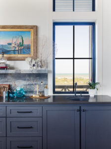 The kitchen is a pure expression of the seaside ease the homeowners desired. Blue-gray cabinets enhance the coastal influence while the stained oak open shelving and pantry with gold-toned mesh add warmth, striking an ideal balance. Eye-catching quartzite adorns the backsplash and counters, drawing attention to the French range, hood and decor. The stained oversized island paired with natural raffia stools add functionality and complete the space. Establishing cohesion with the remainder of the kitchen, the open butler’s pantry adds architectural significance with its stained oak archway, providing extra storage and an opportunity to showcase the owner’s unique orange glassware.