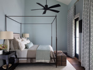 Contrasting the moody and deep tones of the common areas, the owners chose lighter and more traditional beach house hues for the guest bedrooms. Coral pink wall color and palm leaf wallpaper provide an ideal background for the queen-sized beds, and aid in telling the home’s full design story. The large double-bunk bedroom features custom built-in bunk beds and wardrobes highlighted in deep cerulean blue, accenting the white paneled wall. A surfboard focal point rounds out the space and ties in the lighter shades of the decor. In all of the bedrooms, natural textures, softer-toned linen and accent textiles deliver the influence of coastal comfort.