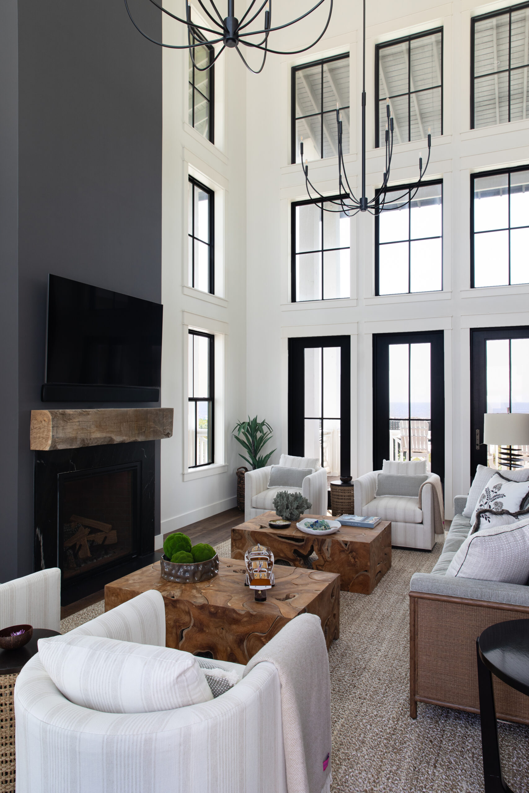 The large living room on the second floor — an ideal space to lounge — exudes a relaxed atmosphere by combining natural textures with neutral-toned upholstery and a black marble fireplace façade. The room’s expansive white walls are accentuated by a dark gray fireplace feature, nimbly suspended iron chandeliers and black framed windows that climb to the 22-foot ceiling giving a nearly panoramic ocean view.