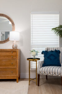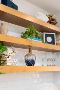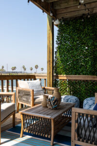 “It needed a complete renovation, design and decoration. When I saw it for the first time, it was old, outdated, small and compartmentalized,” Winnie said. “[Sonia Plemons] surrendered the entire project to me. She wanted to walk in, and it be all done.” The sole guidance the homeowners offered Winnie was a postcard from Pottery Barn. “Sonia gave me a small postcard that had color suggestions on it. She handed it to me and said she liked those colors. Once I had the color scheme, I was able to run with it,” Winnie went on. “I also knew she didn’t want [the design] to scream ‘surfboards.’ The goal was to make it understated but elevated.”