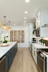 That classic style is evident throughout the home. The kitchen features timeless white subway tile, Benjamin Moore Harbor Blue shaker cabinets, nautical gold hardware and rattan pendant lights. Before the remodel, the kitchen and breakfast room were separate spaces. Winnie created a more spacious and open floor plan by removing the wall between the kitchen and the breakfast room and adding a large island, which can seat 11 people. Now the kitchen is perfect for entertaining.