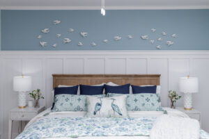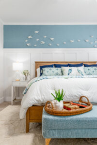 Winnie also created this sense of spaciousness in the bedroom and bathroom. The Sherwin-Williams Languid Blue walls, board and batten chair rail and ceramic dove art above the bed result in an expansive and soothing room.