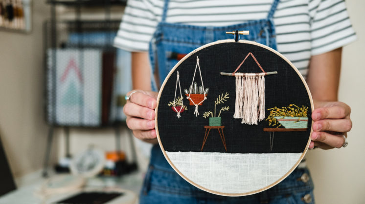 Designs from Home by Harvey range from hoops to air plants and air plant hangers. Her inspiration and style come from mid-century modern antiques and plants. “I’m not the best at keeping plants alive,” she says with a laugh, “but I love the idea of having plants. And with air plants,” she says as she points out one of her newest pieces she has stitched to perfection, “you get to have a plant in your home that will actually stay alive.”