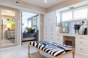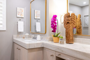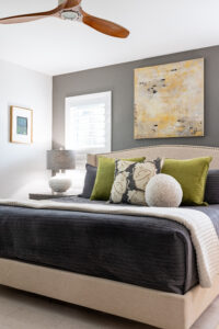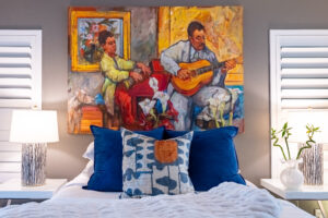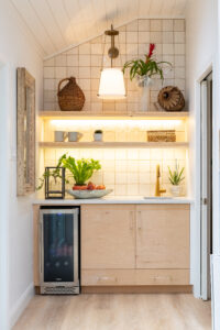 During the renovation, a wall dividing the living room from the kitchen was replaced with a faux, hand-painted wooden beam, creating the open, seamless flow they desired. Working with the bones of the original split-layout, they capitalized on a second primary suite to reinforce their love for hosting. With a flick of the hallway door, guests enter a domain uniquely their own to relax and unwind in privacy.