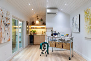 Steps from the main house lies a true surprise: A recently constructed free-standing art studio has been carefully incorporated into the backyard landscaping. As a practicing artist, Dellinger thrives in the uncomplicated, yet expedient space where she creates stunning canvases she adds to many of the rooms.