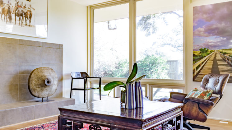 Artistic value continues through the choices and placement of furniture and decor. The family room offers a fresh, vibrant color scheme with plush blue chairs sitting atop a multi-colored rug in geometric shapes, while the living room provides a warmer touch with taupe couches, leopard print low-seating chairs, and a multi-colored rug in deep shades of burgundy and cream. A masculine touch is presented throughout the home in the form of hunting trophies.