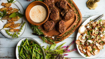 Recipes for Pepper-Crusted Filet of Beef Tenderloin with Horseradish Sauce, Skillet-Fried Potatoes, String Beans, and Chèvre-Stuffed Squash Blossoms
