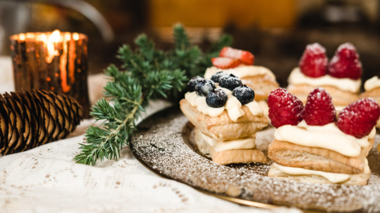 Using a serrated knife, cut the napoleons into 12 equal pieces and top with berries of your choice. Garnish with sifted confectioner’s sugar and serve chilled.
