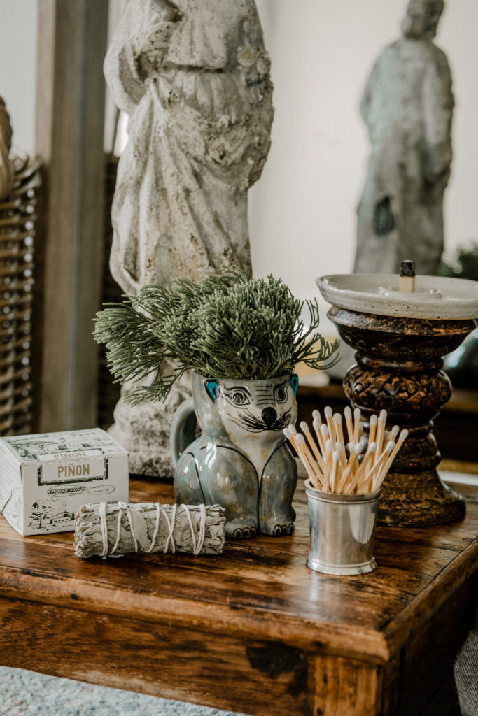 Incense from Commons | Kitty Mug and Sage from Sew Bonita | Cushion and Shawl from HomeGoods | Wood Table from Baba One Of A Kind