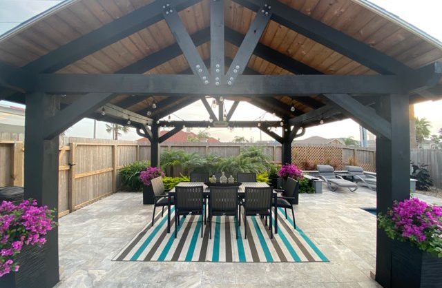 When our landscape clients Shawn and James first contactedbrus about their new backyard, they knew they wanted an island oasis feel, withbrthe versatility to relax alone or entertain friends. With a great pool, largebrcovered dining area, and a smaller pergola with a built-in fire pit already inbrplace, we were able to choose and install plants to tie the whole projectbrtogether.