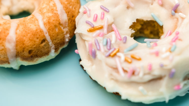 We discovered that cake donuts (baked in the oven rather than fried) offered the best flavor and versatility, but at a highly reduced calorie count! By baking instead of frying your donuts, you can serve them more often … and eat more of them when you do.