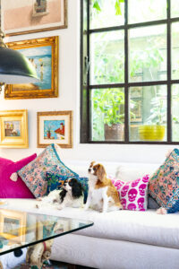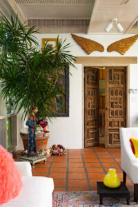 The mélange of color and nature prompts feelings of joyous familiarity while sitting on the large sofas amid lively textiles and an assemblage of the owners’ favorite items. Reichert is a true treasure hunter, whose expansive exotic shell collection is perfectly displayed along the sills.