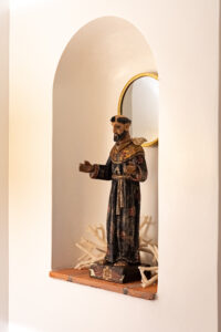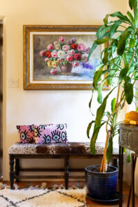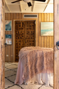 Once used as the gas station’s office area, the primary bedroom sits directly off the formal living room. Saltillo tile runs through the bedroom, where antique birch doors tie the past to the present for Reichert. “The doors have cool little hidden windows that open up,” she said. “We used to play with them, and now my grandkids use them for puppet shows.”
