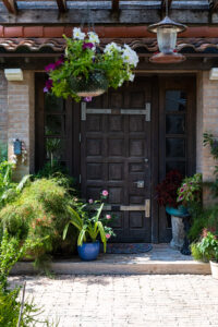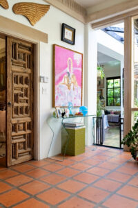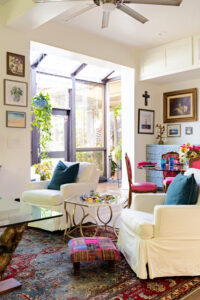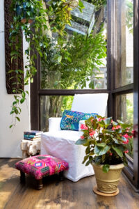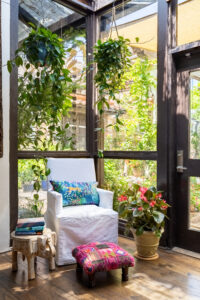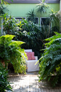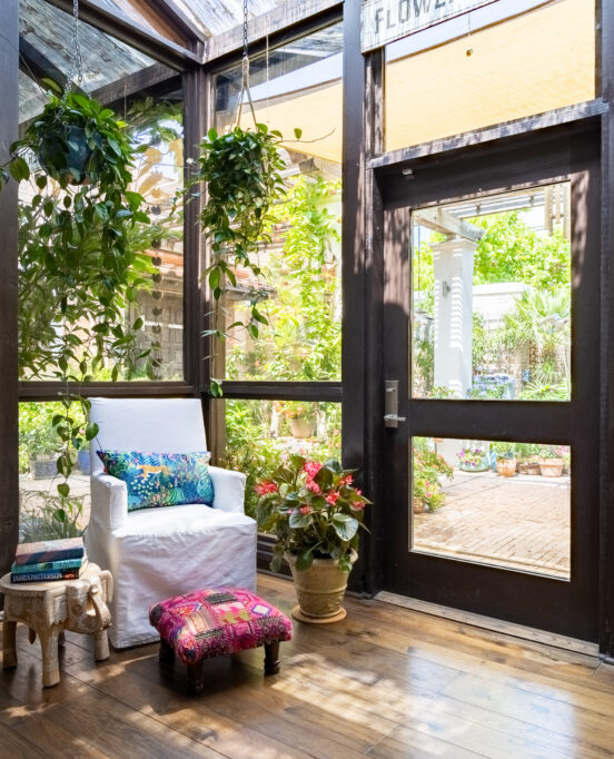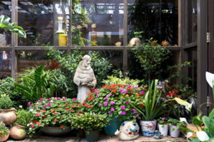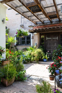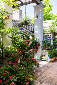 In the large courtyard, John works hard at nurturing the Eden that envelops every corner. “We are stewards of [the] plants; she picks them out and I grow them,” he said. Pots of blooms and shrubs hang from the tall pergola above a brick path, offering physical form to whimsicality.