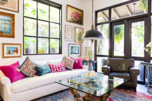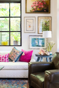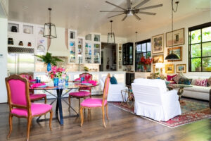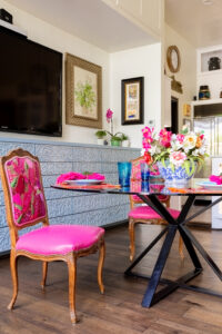 “I love a white background, so I can fill it with color,” Reichert explained. Although hot pink for dining chairs is bold, in this home, it doesn’t just thrive; it inspires an elegance that anchors its designated territory and unifies the spaces.