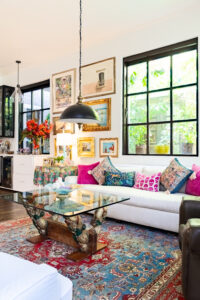 White walls provide a clean canvas for a collage of colorful artwork between black steel-frame windows. The colorful art and eclectic decor, combined with a low-hanging focal pendant and modern textures, add to the bohemian Brooklyn loft aesthetic.