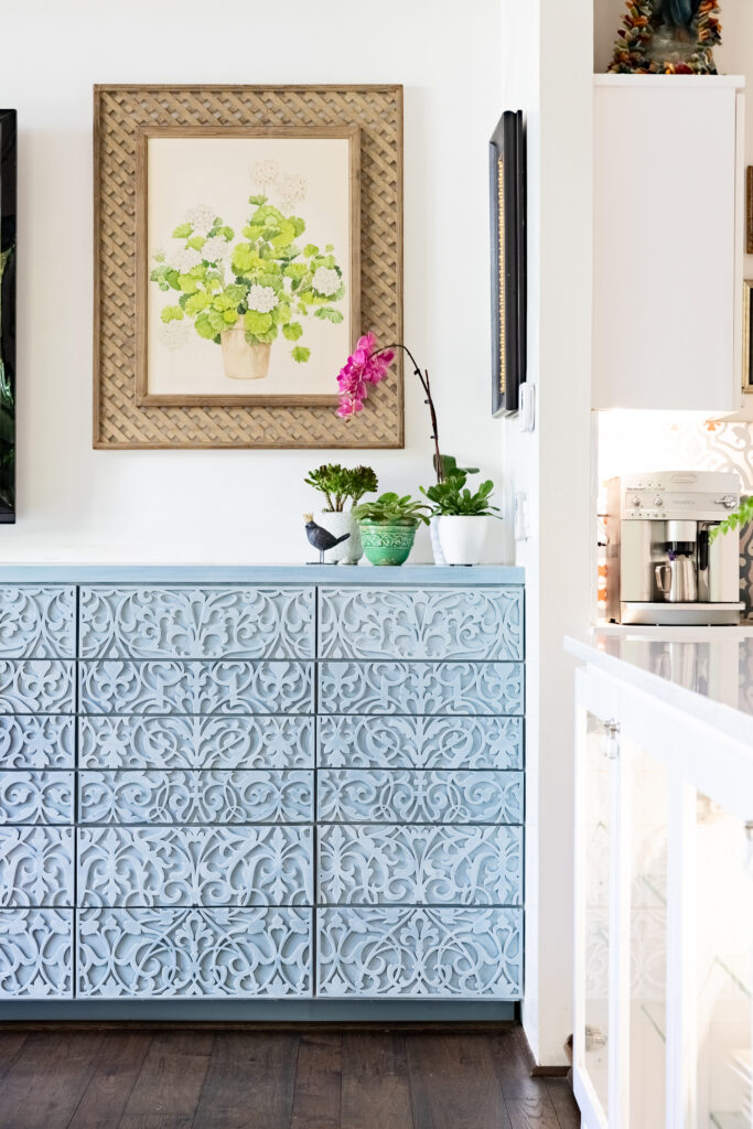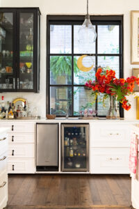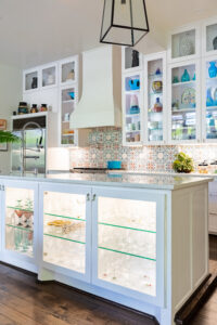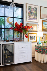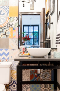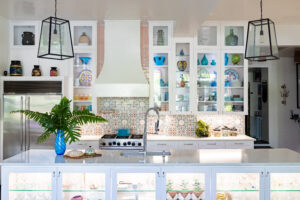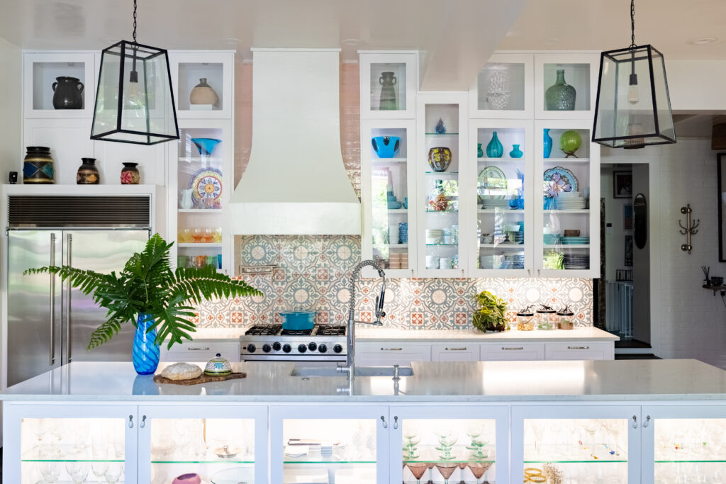 The Reicherts had more than aesthetics in mind when designing the 20-foot-long built-in buffet featuring intricately carved custom drawer fronts, full-height glass front cabinets and an expansive kitchen island. The illuminated cabinets have an abundance of storage and display vibrant serving platters and glassware, paying tribute to the colorful life they have lived. Below, Mexican-influenced encaustic tiles line the backsplash and effortlessly complement the half bathroom flanking the kitchen.