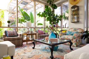 Large format Saltillo tile flooring spans the length of the formal living room encased in floor-to-ceiling windows, transforming the space into a reverse atrium and giving a panoramic view of the lush flora that fill the surrounding courtyard. Remaining true to the original architectural detailing, the Reicherts restored the ceiling millwork treatment which craftily conceals modern air conditioning.