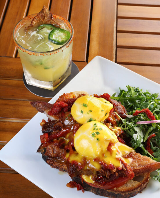 When a brunch spot has an entire portion of the menu dedicated to this staple, you know it’s going to be good. This version lays seared pork belly atop two pieces of housemade sourdough, topped with poached eggs, sundried tomatoes, a bacon marmalade and hollandaise sauce. 11862 HWY 361