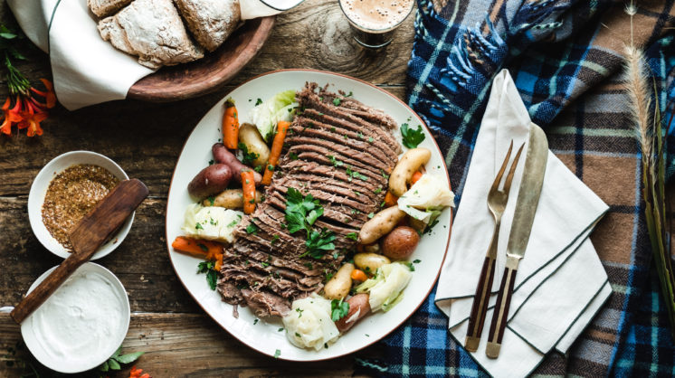 Cooking your corned beef and cabbage is a wonderfully simple one-pot preparation. Simmering the vegetables with the roast adds layers of succulent flavors. We paired this dish with a specialty brew called 1799 Stout by Lazy Beach Brewery in honor of St. Patrick’s Day.
