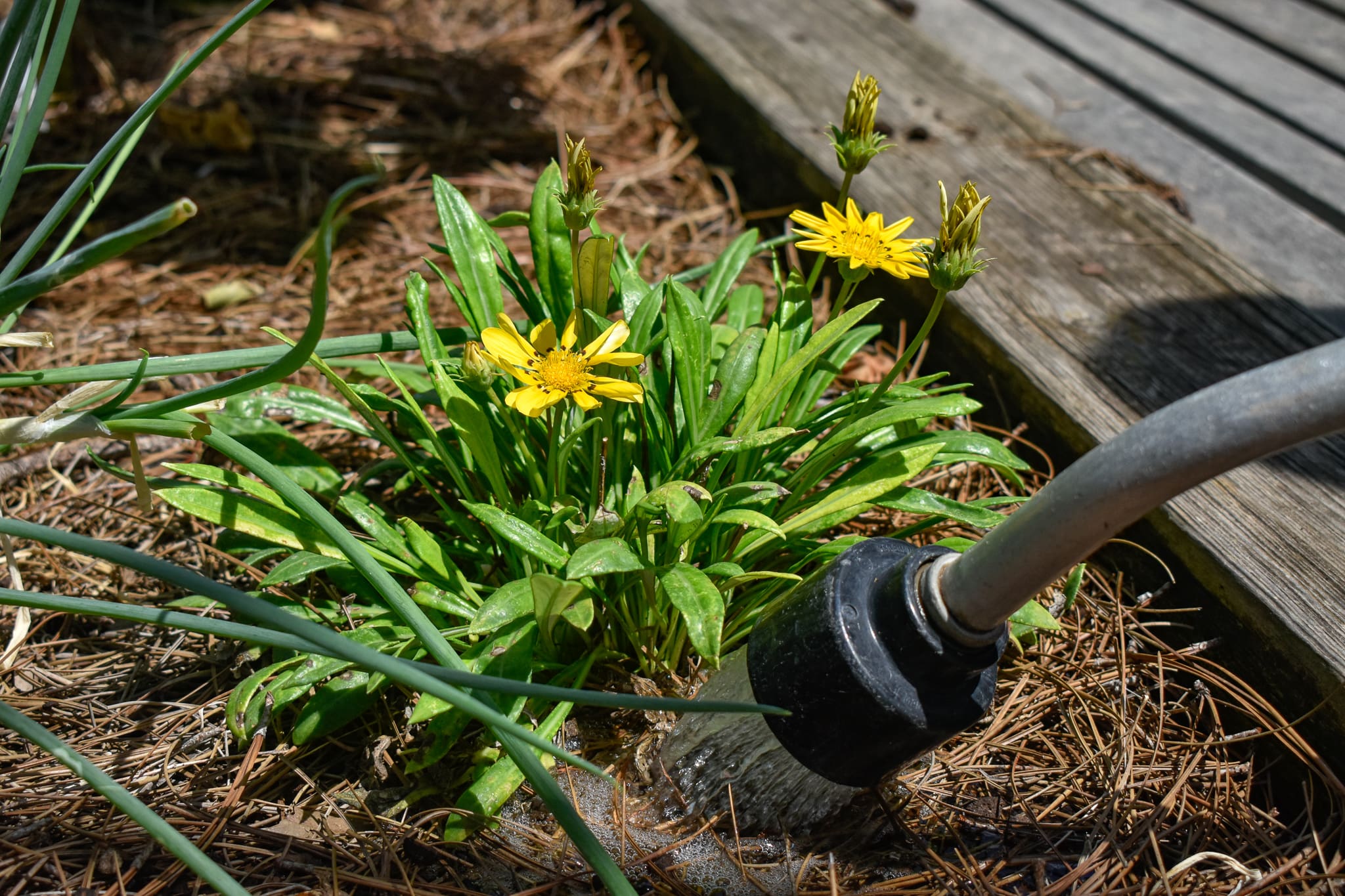 The name of the game for summer watering is to maintain depth moisture. This means watering plants slow, low, and deep. Use a watering wand and water at ground level to get water down to the roots – don’t water over the top of your plants! Also, don’t water full blast. Turn down the pressure, water slowly, and use the cycle-soak method which means water once, let it soak in, then water again to get water down deep. A proper mulch layer is your best friend for maintaining this depth moisture due to the cooling/insulating effect we’ve discussed, and because it prevents evaporation. Not only does mulch help the soil retain moisture, it also keeps soil from splashing up onto the plant when you water, which prevents fungal disease. Be sure you spread the mulch evenly and avoid creating the dreaded “mulch volcano” around the trunks or main stems of plants and trees. Mounding mulch up against the trunk can invite disease. Best to mulch around trees and plants then pull mulch away from the trunk to create just a little space.