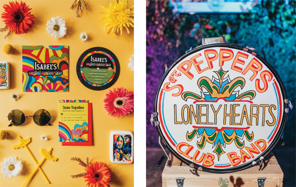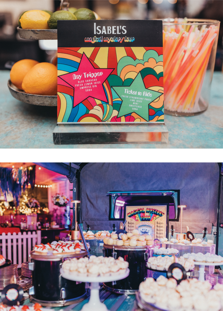 For a special debutante affair, a fabulous psychedelic theme was set due to the party girl’s love for the Beatles. From the invitations featuring groovy illustrations to signature cocktails with names like “Day Tripper” and “Ticket to Ride,” the theme was brought to life in every corner of the party.