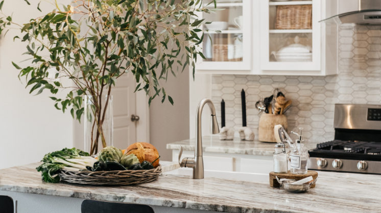 Placing a large branch cut from your yard will bring a sense of peace and nature. If your island has a sink, keep soaps in glass dispensers, sponges in silver pots and Bar Keepers Friend in vintage sugar shakers. Placing wholesome snacks in a large basket encourages healthy noshing. While kitchen table talks will always be popular, in today’s busy world, island chisme should never be taken for granted.