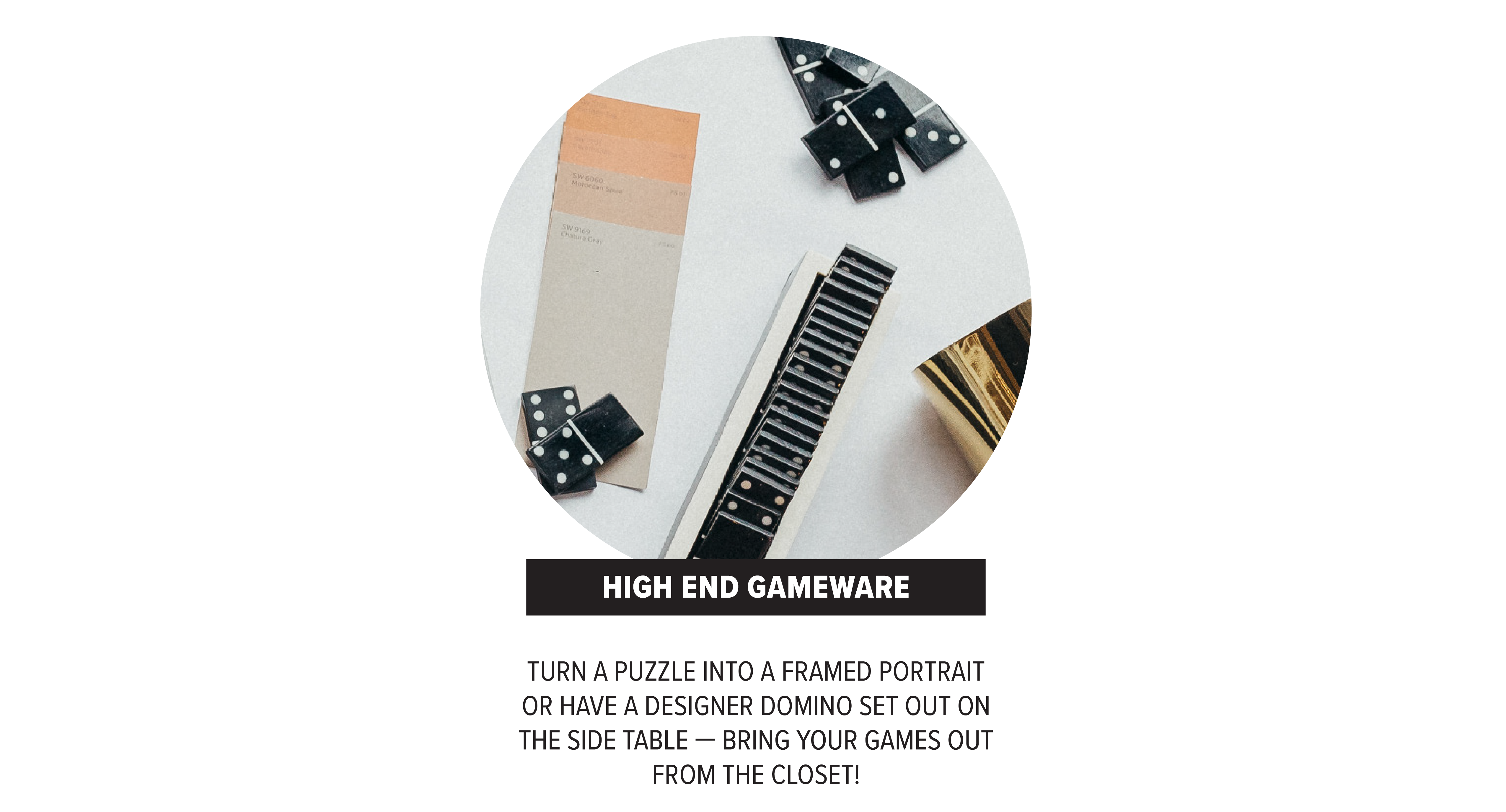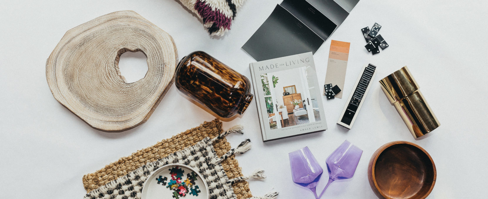 Pillow, gold vase, clay bowl, wood bowl and leopard glass West Elm. Rugs, dominos and wood plateau Chic to Chic. Colored glassware Park Seven. Book Barnes and Noble. Paint samples Sherwin-Williams. Puzzle Lady Captain.