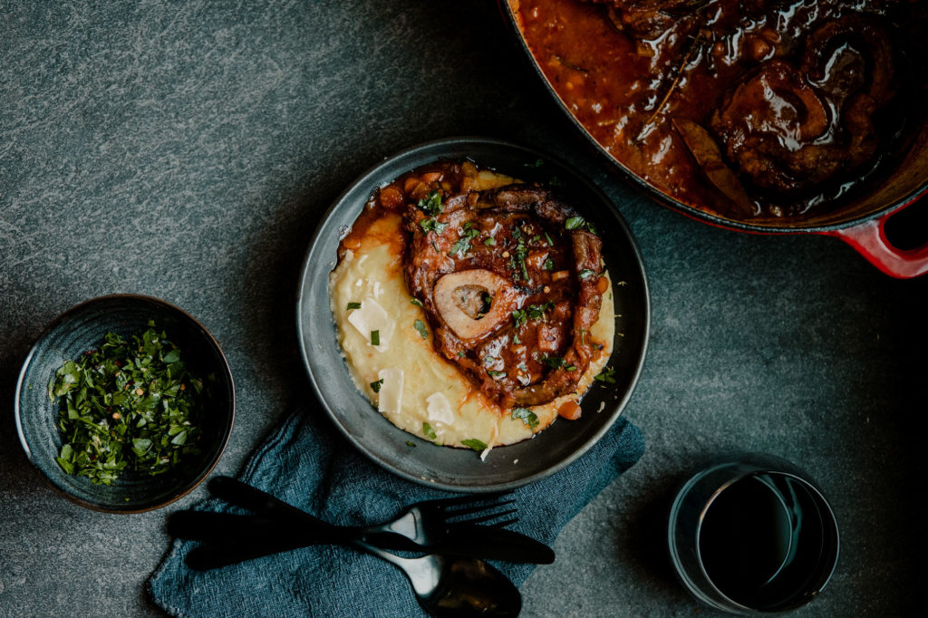 Roast for 1 hour and 30 minutes, until fork tender. While the shanks are cooking, prepare the gremolata (recipe on photo description) and polenta (recipe on pg. 96).