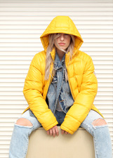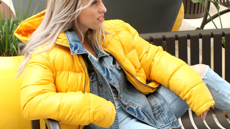 Yellow Hooded Puffer Coat  GUESS $225    |     Medium Wash Denim Jacket  Black Rivet $59.88