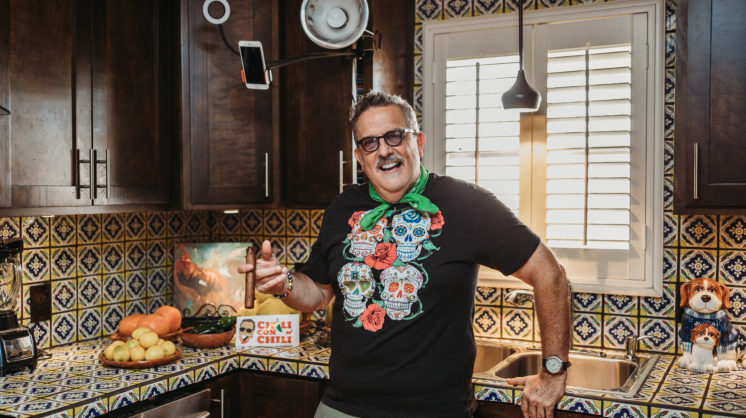 The idea of Chili con Chili came to me from a book I was reading about a successful businessman in Mexico, and how he chose to do something out of his comfort zone and how that became a passion of his new life. I decided I wanted to do a cooking show because the ones on TV can be boring or not funny. So, I put together a team. I asked my partner of 30 years to be the producer of the show, “Freddy the Producer” – even though his job is mainly to pick out a different bandana for me to wear each episode and answer the door when the surprise taster rings the doorbell. Reno the Dog “El Reno,” one of our five dogs, walks around while I cook, and (I asked) our best friend Sam, “Sam the Taster” to ring my doorbell 15 minutes after the show started and to come in and taste the food I was cooking. Everyone fell in love with Sam; he stole the show. Sadly, Sam passed away last year, and we decided to continue to do the show in his honor and allow a different surprise taster every show.