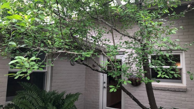 It is multi-trunked and considered an ornamental tree, meaning that it stays under 25′ (its actual finished height is around 15′). The birds love this tree! It produces red berries in the fall that the mockingbirds devour, and all kinds of migrating birds stop off in our courtyard to get water from our re-circulating birdbath and rest in our tree. It does lose about 3/4 of its leaves in the winter, but because the leaves are small, it isn’t a chore to clean up. They can be expected to live 25-50 years and very hardy against cold and heat. I have never had to spray this tree for insects!
