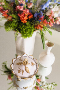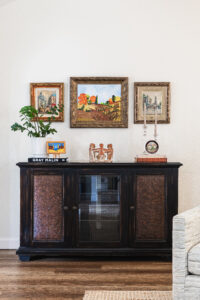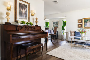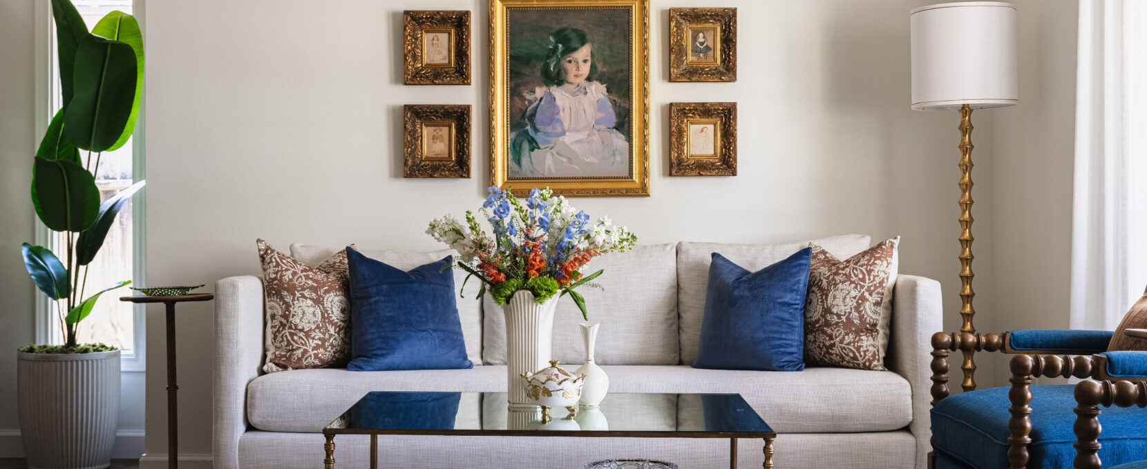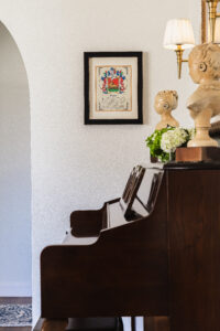 In the more intimate sitting room, history takes center stage. A piano—where all five of Sandra’s children learned to play—remains proudly positioned. Above a tailored ivory sofa, a collection of heirloom frames surrounds a central portrait. Brass and glass tables introduce lightness, while deep blue accent chairs ground the palette. Linen drapery softens the room, allowing it to feel refined and welcoming.