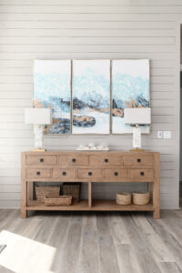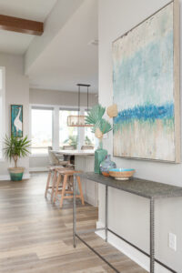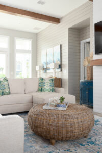 That design includes large-scale, colorful art, a color palette of blues, aquas, sands and stones, and natural materials like driftwood, cane and glass. The mix of textures and patterns creates a bold and fun space. These lively patterns are balanced with classic design elements like the neutral shiplap, white shaker kitchen cabinets and wooden beams.