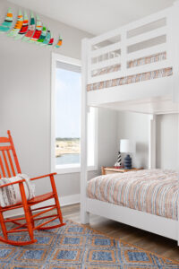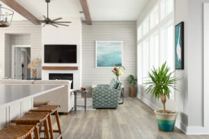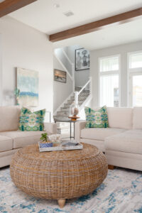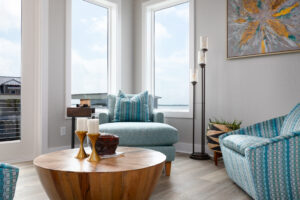 The living room, which is open to the kitchen and dining room, features enough seating for a large group, a modern fireplace with a natural wood mantel and stunning views of the canal. However, the upstairs loft is the homeowners’ favorite. “I love the fabric and colors up there. It’s the perfect reading nook,” Hailey said. “I wanted to make that a fun little area, but we had to be creative with it since it’s a small space. We added swivel chairs and a chaise, and now it’s a fun and relaxing spot,” Pruett added.