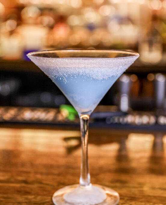 Inspired by Jack Frost and candy canes, the Frostini is a must this holiday season. This chilly treat, a true winter blue, is made with Live Oak Vodka infused with butterfly pea blossoms, mixed with peppermint schnapps and Mozart white chocolate liqueur. Served in a martini glass with a sweet, sugar-topped rim, the Frostini delivers a strong yet smooth sip to transport you right into a winter wonderland.