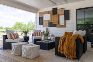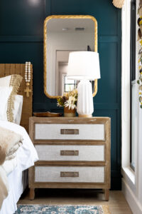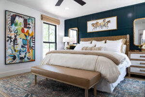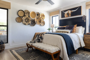 In the primary bedroom, a deep cerulean paneled statement wall and the colorful hues of the custom abstract canvas, equestrian artwork and glass windchime wall hanging generate a clever palette of rustic sophistication. Echoing the panel’s texture, the woven leather headboard is the foundation for crisp neutral bed linens which bring out the subtle tones of gold and tan in the surrounding decor.