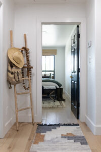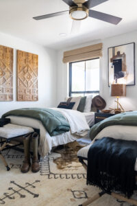In the guest bedrooms, an emphasis on the ranch aesthetic shines in the details of Liza’s design. Black shiplap creates a custom built-in headboard for the queen bed, while cowboy hats, raw wood and leather finishes reinforce the western roots of the home. The longhorn painting, by local artist Rebecca Bradford, was specifically chosen for its unmatched authenticity and unique cold wax and oil paint technique to create a tactile leather-like finish. Each bedroom embodies individual ranch flair with varying finishes and furnishings.