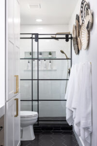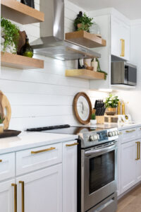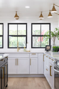 The farmhouse style stands out with white shiplap walls, open wood shelving and clean lines punctuated by the black frame windows and schoolhouse-style pendants. Raw wooden textures and antique wildlife paintings, inherited from Dr. Winnie’s great-grandmother, mix seamlessly with the bronze library wall lights and modern appliances to produce the perfect blend of designs.