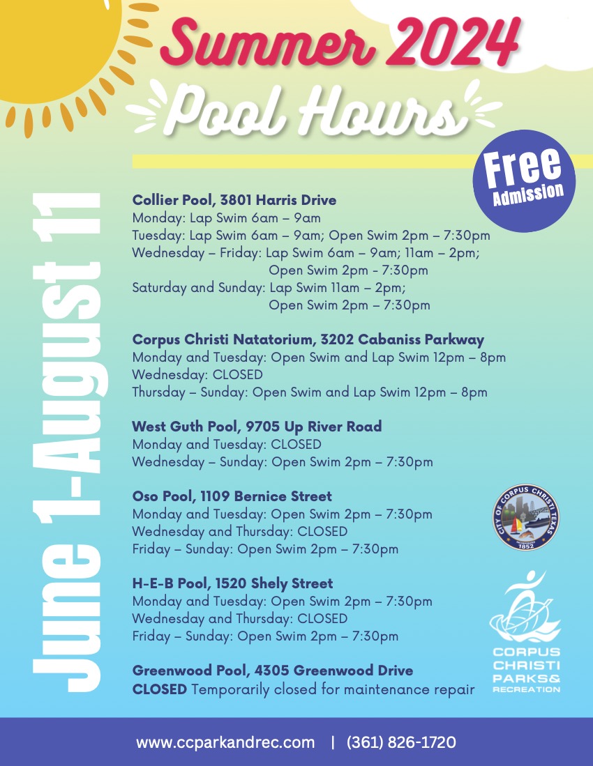 All Corpus Christi city-run public pools have a lap pool area, a shallow or zero-depth entrance with splash features great for small kids and free admission all summer long!