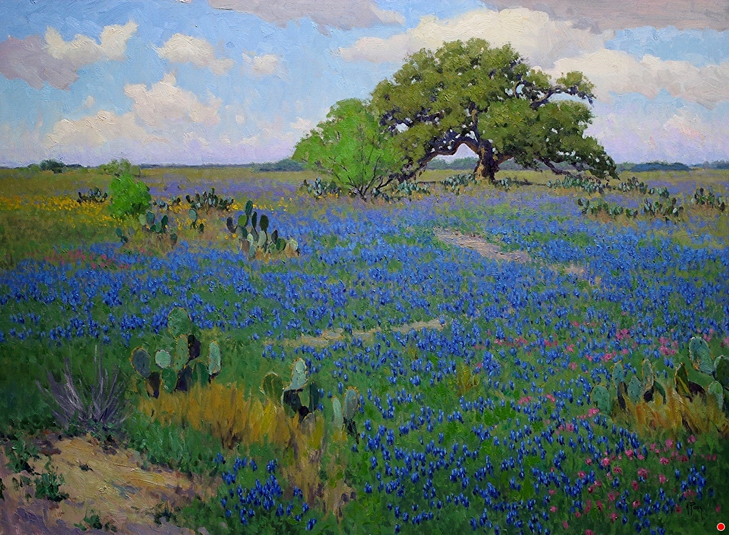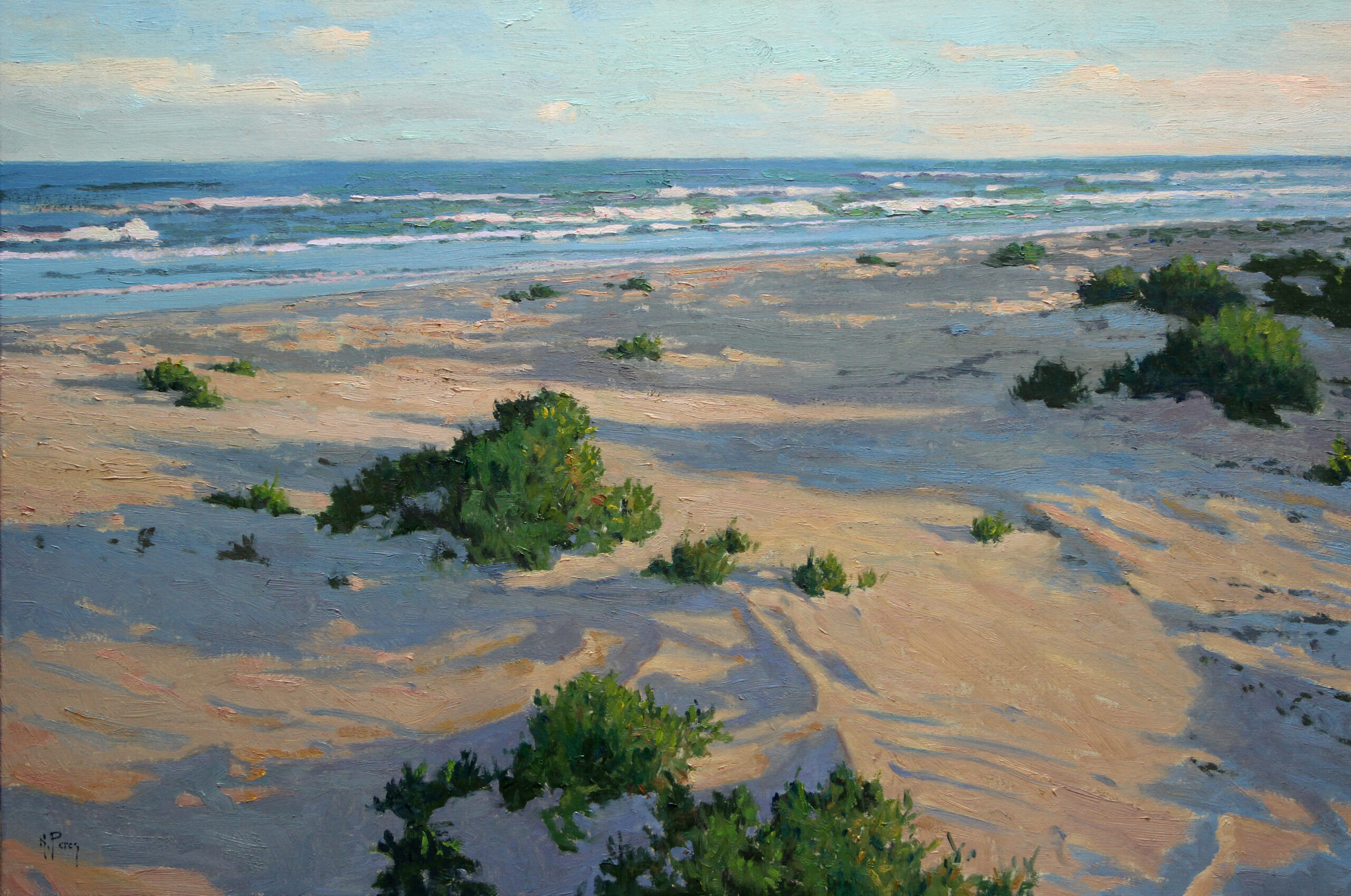 “Most of my work is pure landscape without the presence of man,” Perez said. “That’s hard to find. I have always wrestled with how much of that human element I want to show.” In his work, the man-made elements featured are often old or worn down amid nature, reflecting his perception that although these structures are here now, they are temporary. “Eventually, it all goes back to the land.” An admirer of the American Impressionist movement and early Texas painters, Perez draws similarities between the near-photographic qualities of his work and those of impressionists who seek to portray their subjects close to real life. The attempt to replicate the feeling of looking at subjects as they exist in nature — the precise moment of sun setting over a country road and the shadows cast by trees, cacti, cattle — drives Perez in each of his works.