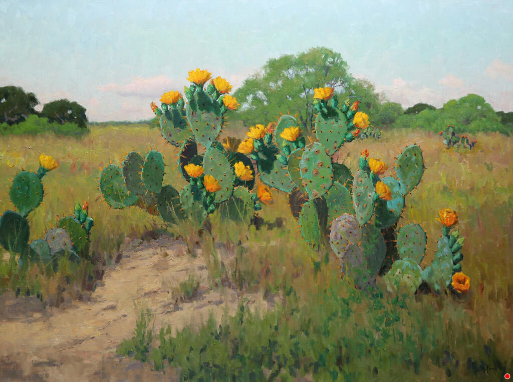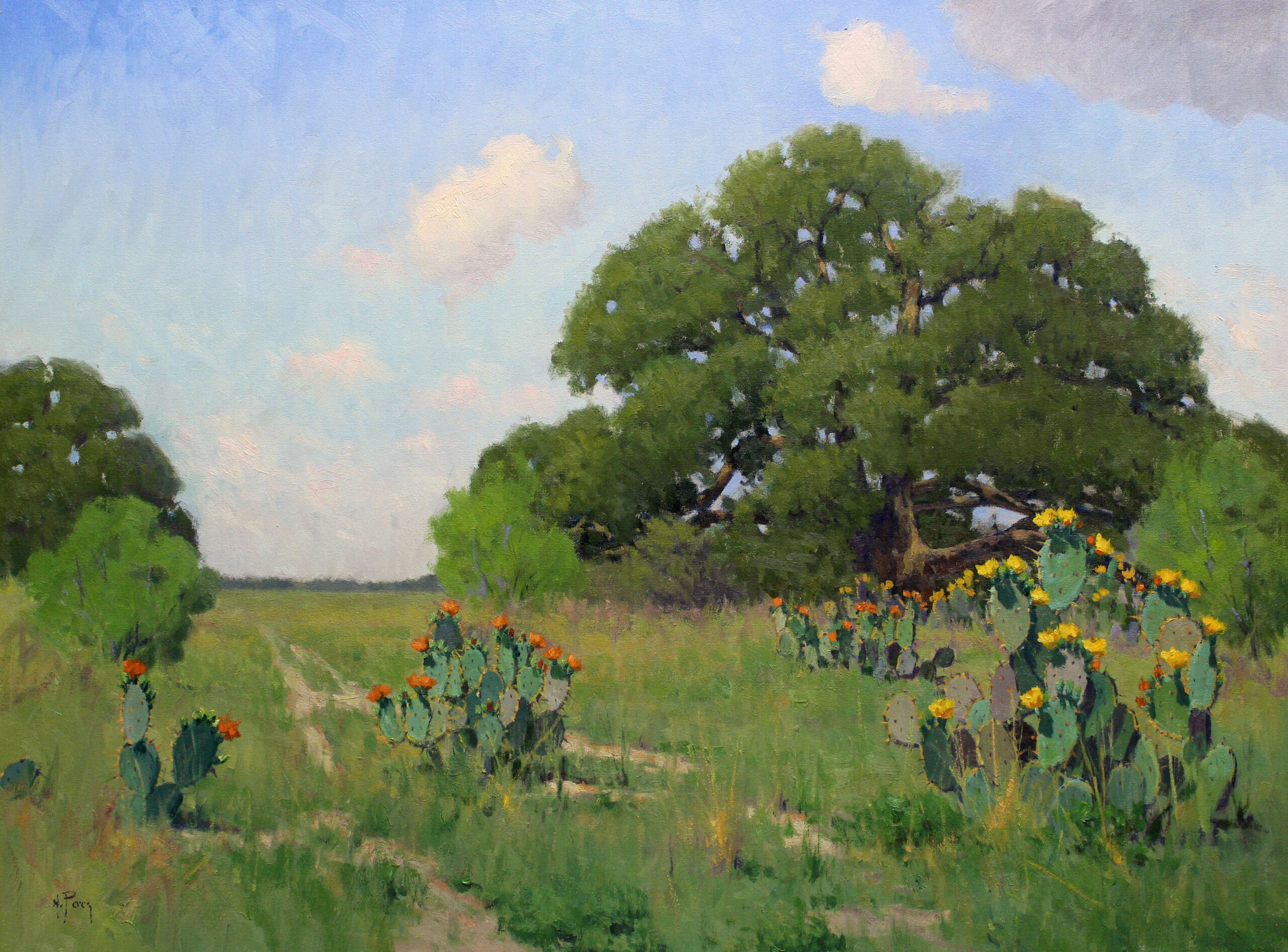 Growing up in the brush country between the Gulf Coast and the border, Noe Perez began a quest to capture the austere, beautiful landscape in the gaps between human impact. Perez, the son of a cowboy in Falfurrias, would often follow his father out into the field to watch him at work among the oak trees, mosquitoes and cacti. “Those things have become my main subject,” Perez said. “It’s that kind of nostalgic feeling I’ve been around since I was a kid.” This sense of familiarity and closeness to the landscape is ripe in the smallest detail and corner of each painting.
