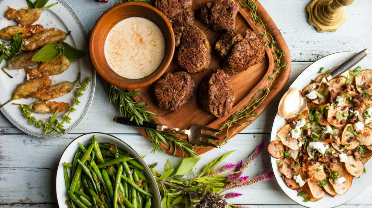 This homemade horseradish sauce gives a spicy zing to the steak. The creaminess of the sauce tames the peppery rub while adding layers of beautiful flavor to the dish. Steak needs potatoes. These thinly-cut fried potatoes are crispy with soft centers, the best of both worlds. Generous dollops of sour cream and local goat cheese feta punch up the flavor with a finish of chives and parsley. These are complex and wonderful flavors for such a simple dish.