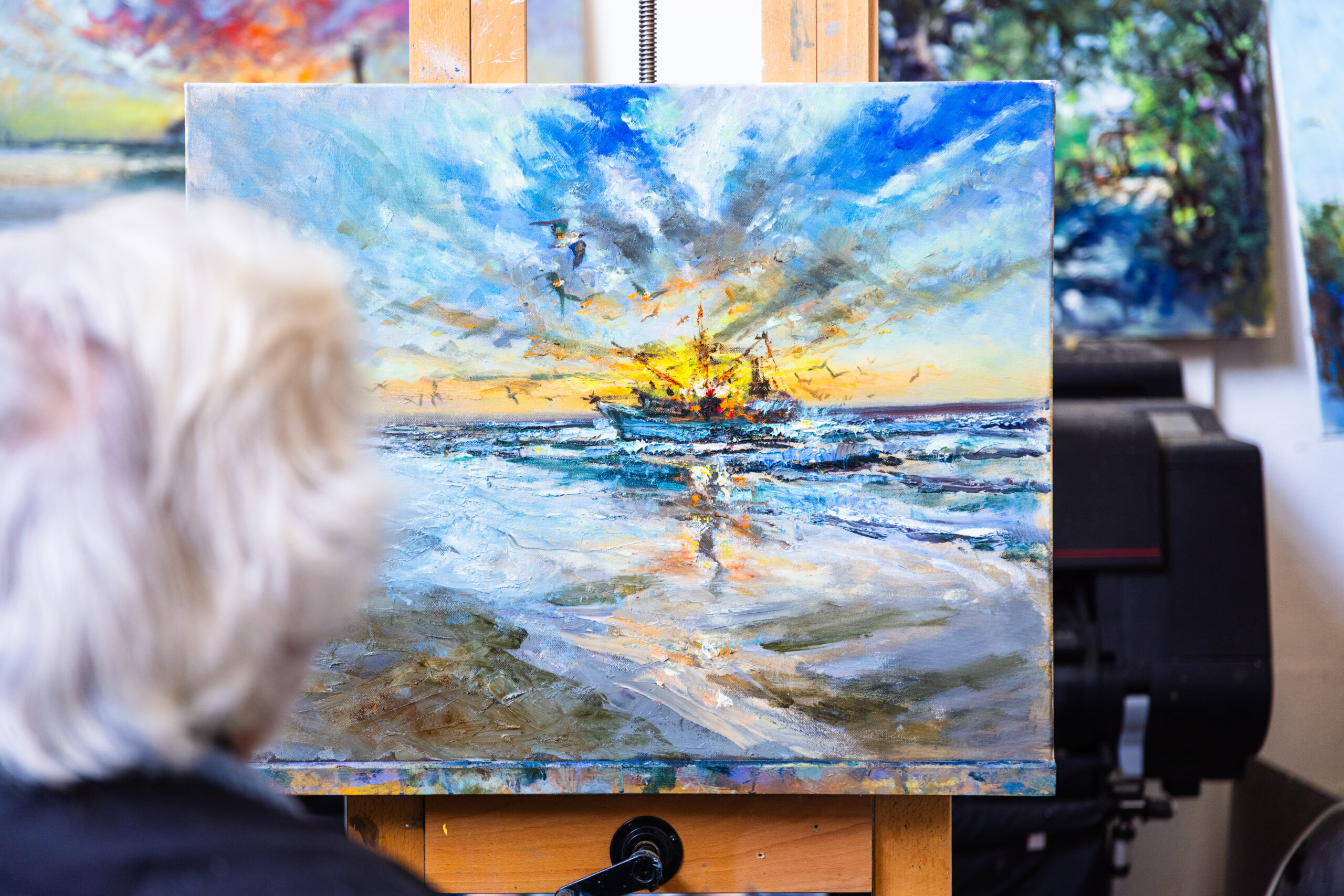 “I sit down at a blank canvas and begin painting areas, just trying to get some excitement from the very get‑go,” Russell explained. From that initial abstract energy, he gradually shapes light and shadow, form and movement, until the work drifts naturally toward impressionism. “And then,” he said, “I keep whittling away at it until certain elements become realistic—focal points, details.”
