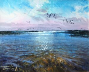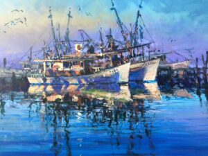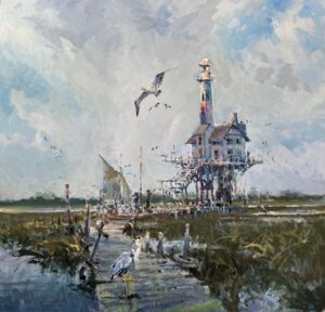 As a South Texas artist, Russell draws inspiration from the Gulf Coast and the quiet pockets of wonder he encounters while traveling. Sometimes the familiar becomes invisible, he mused, like “not seeing the forest for the trees.” But when he travels—whether along the Texas shoreline or farther along the eastern seaboard—new light, new forms, new scenes ignite his imagination.