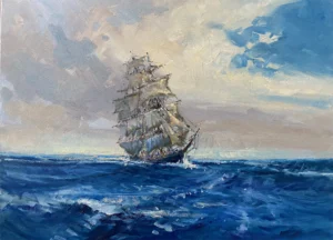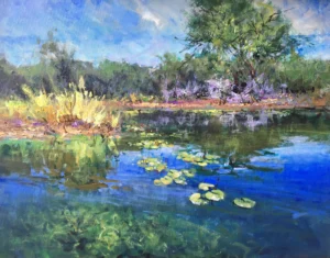 “I sit down at a blank canvas and begin painting areas, just trying to get some excitement from the very get‑go,” Russell explained. From that initial abstract energy, he gradually shapes light and shadow, form and movement, until the work drifts naturally toward impressionism. “And then,” he said, “I keep whittling away at it until certain elements become realistic—focal points, details.”