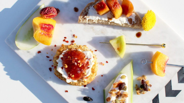Top – Toasted honey whole wheat bread with goat cheese topped with balsamic grilled peaches