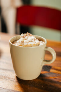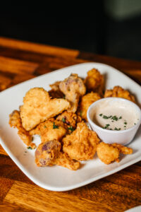 Diving into The Galley feels like exploring an underwater den for creatives. Watery-hued paintings from a rotation of local artists like Kaleigh Glover and Teresa Robertson adorn alabaster walls. In the hull, chefs, cooks and servers gracefully flit in and around ovens and cooktops. A helm decorated with a whisk and rolling pin hangs near the door, proclaiming “U.S.S. Chefs.”